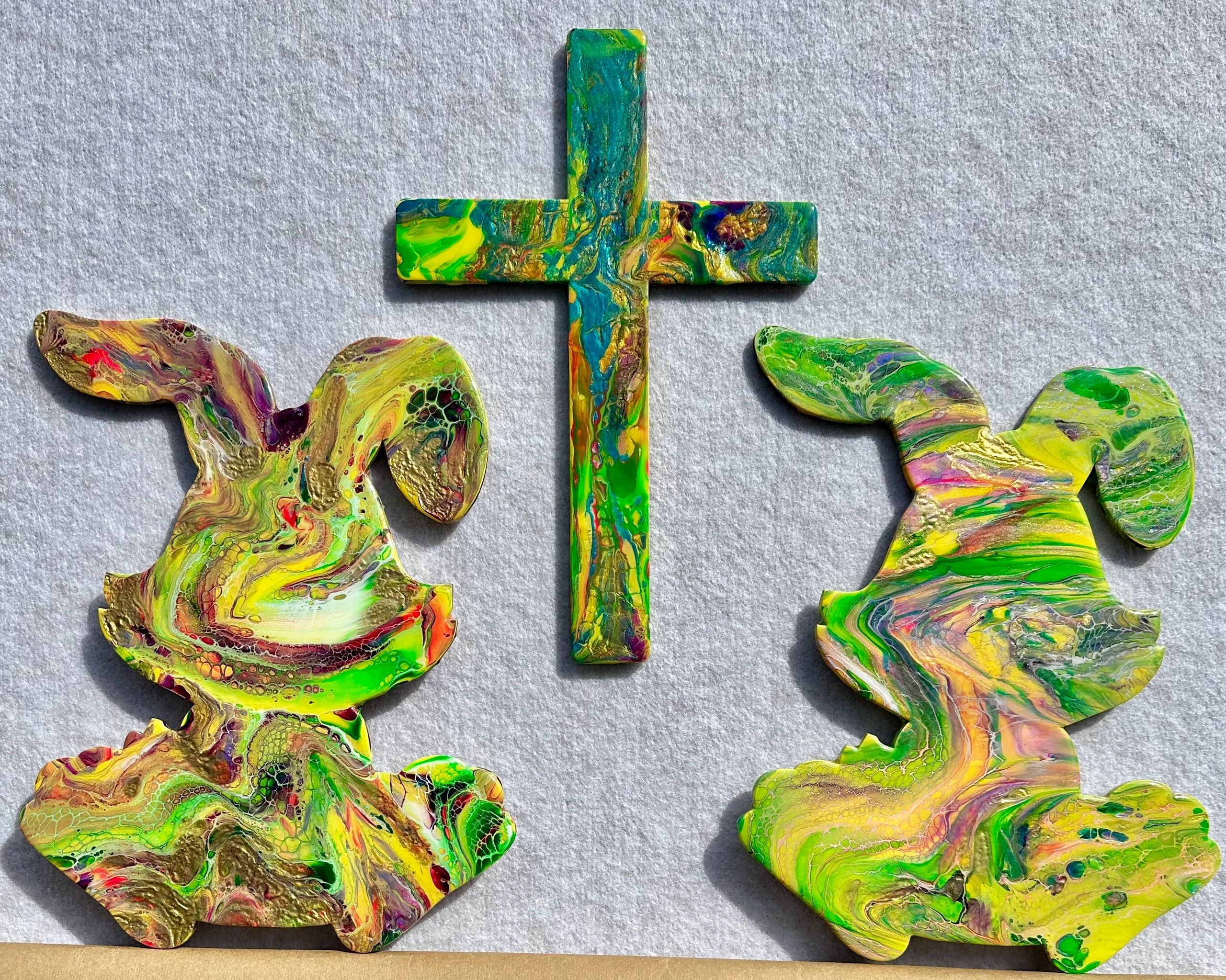 Three pieces. One season. No duplicates. This Easter collection includes two hand-painted bunnies and a custom cross each created with fluid acrylic paints and finished with epoxy resin for completely unique finish. Visit our store to purchase!